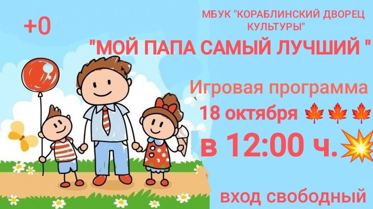 18 октября, в 12:00, в танцевальном зале Кораблинского Дворца культуры вас ждёт увлекательная развлекательная программа «Мой папа самый лучший».