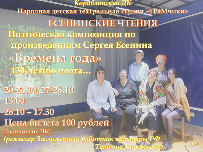Поэтическая композиция «Времена года» по произведениям Сергея Есенина, посвящена 130-летию поэта. В спектакле занята народная детская театральная студия «ТРаМчики» Кораблинского Дворца культуры. В исполнении студийцев прозвучат в основном малоизвестные произведения поэта.