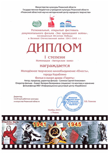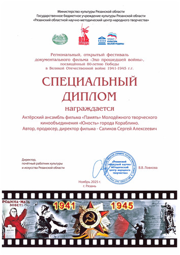 6 ноября в Рязанском областном научно-методическом центре народного творчества состоялся семинар-практикум и церемония награждения участников открытого фестиваля документального фильма "Эхо прошедшей войны". Кораблинский округ на фестивале представило Молодежное творческое объединение "Юность" (руководитель Сергей Саликов) фильмом в жанре Драма "Память". По итогам работы экспертного жюри фильм удостоен Диплома 1 степени в номинации "Авторское кино" (автор, продюсер, директор фильма Сергей Саликов, оператор Валерия Азамат). Актерский ансамбль фильма "Память удостоен Специального Диплома. В фильме снялись: Елена Дунина (директор МБУК "Кораблинский ДК", Стелиан Гыске (Кораблинский ДК), Алина Измайлова (участница народной детской театральной студии "ТРаМчики" - режиссер Заслуженный работник культуры РФ Татьяна Кочеткова, Игорь Погодин и Сергей Бобров (текст за кадром) (артисты Заслуженного коллектива РФ, народного театра "ТРаМ" - режиссер Заслуженный работник культуры РФ Татьяна Кочеткова) и другие. ФИЛЬМ "ПАМЯТЬ" можно посмотреть ЗДЕСЬ ПОЗДРАВЛЯЕМ с ПОБЕДОЙ!