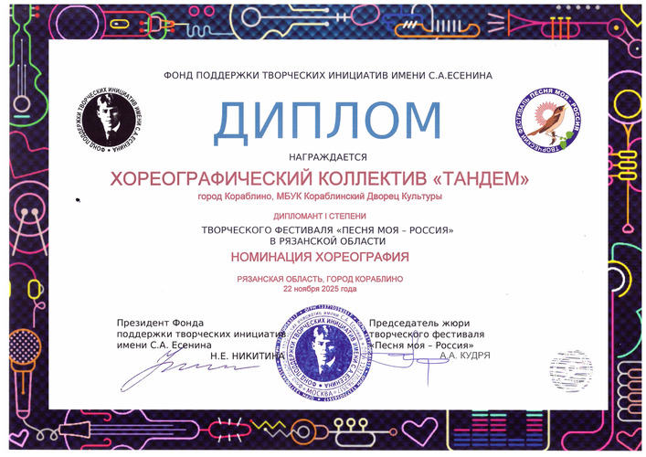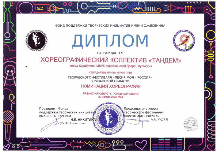 22 ноября в Кораблинском Дворце культуры состоялся творческий Фестиваль при участии Фонда поддержки творческих инициатив имени С.А. Есенина «Песня моя – Россия». Организаторы фестиваля: Правительство и министерство культуры Рязанской области, администрация Кораблинского муниципального округа, ГБУ города Москвы «Юго-Восток» по работе с населением по месту жительства. В Кораблинском Дворце культуры на фестивале были представлены номинации: В состав жюри вошли специалисты по вокалу и хореографии, председатель - Арсений Кудря (режиссер Рязанского театра драмы). По итогам фестиваля коллективы Кораблинского Дворца культуры стали обладателями высоких наград: Хореография - хореографический ансамбль "Тандем" - ГРАН-ПРИ, приз "Выбор зрителей", Дипломант I степени; -танцевальный коллектив "Обаяние" - Дипломант II степени; Художественное чтение - Зотов Александр (народная детская театральная студия "ТРаМчики") - Дипломант I степени; -Алина Измайлова - (народная детская театральная студия "ТРаМчики") - Дипломант II степени; Вокальное исполнительство - вокальный ансамбль "За околицей" - Дипломант III степени; Декоративно-прикладное искусство - любительское объединение "Очумелые ручки" (Кипчаковский СДК) - Дипломант I степени; - Соломатина Светлана Александровна (Семионовский СДК)- Дипломант II степени. ПОЗДРАВЛЯЕМ коллективы и руководителей с ПОБЕДОЙ!