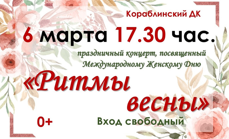 Приглашаем 6 марта в 17.30 час. в Кораблинский Дворец культуры на праздничный концерт, посвященный Международному женскому дню.
